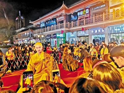 當(dāng)晚7時(shí)許,途經(jīng)表演現(xiàn)場(chǎng)的人流從四面八方聚攏于此,人們頻頻舉起手機(jī)將鏡頭對(duì)向眼前裙袂飛揚(yáng)、舞姿優(yōu)美的“大地灣女神”和頷首微笑、靜若處子的“東方微笑”,一時(shí)間,閃光燈忽明忽暗此起彼伏,行人你來我往人聲鼎沸,步行街頃刻間歡聲笑語、熱鬧非凡。記者發(fā)現(xiàn),扮作“不倒翁”的“女神”模仿大地灣出土的人頭瓶外部特征,而一旁采用懸浮藝術(shù)呈現(xiàn)的“小沙彌”,打禪靜坐、頷首微笑。
