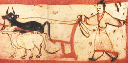 此后,在酒泉丁家閘十六國墓壁畫中就只有一牛牽引的雙轅犁了。說明魏晉時期是中國從二牛單轅犁過渡到一牛挽拉雙轅犁的時代,這一過渡的狀況及特點出現(xiàn)在嘉峪關(guān)地主墓葬壁畫中,又說明甘肅是這一重大農(nóng)技改革的地區(qū)之一。