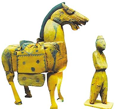 張掖高臺縣駱駝城遺址出土的胡俑牽馬木雕