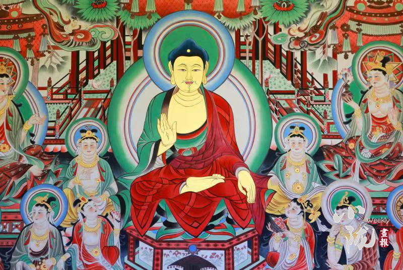 近日,一副長(zhǎng)15米、高6米的大型臨摹復(fù)制敦煌壁畫(huà)《無(wú)量壽經(jīng)變》在武威鳩摩羅什寺完美竣工,將于近期對(duì)外開(kāi)放。