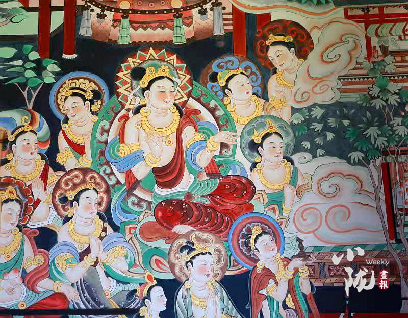 該壁畫(huà)是按照敦煌莫高窟第220窟唐代《無(wú)量壽經(jīng)變》壁畫(huà)為原型,選址鳩摩羅什寺旃檀佛殿正面墻體,由敦煌畫(huà)院畫(huà)師張杰龍臨摹再創(chuàng)作,融入了敦煌莫高窟唐代112窟壁畫(huà)局部經(jīng)變內(nèi)容,與原作既有相似,但又不完全是原作。