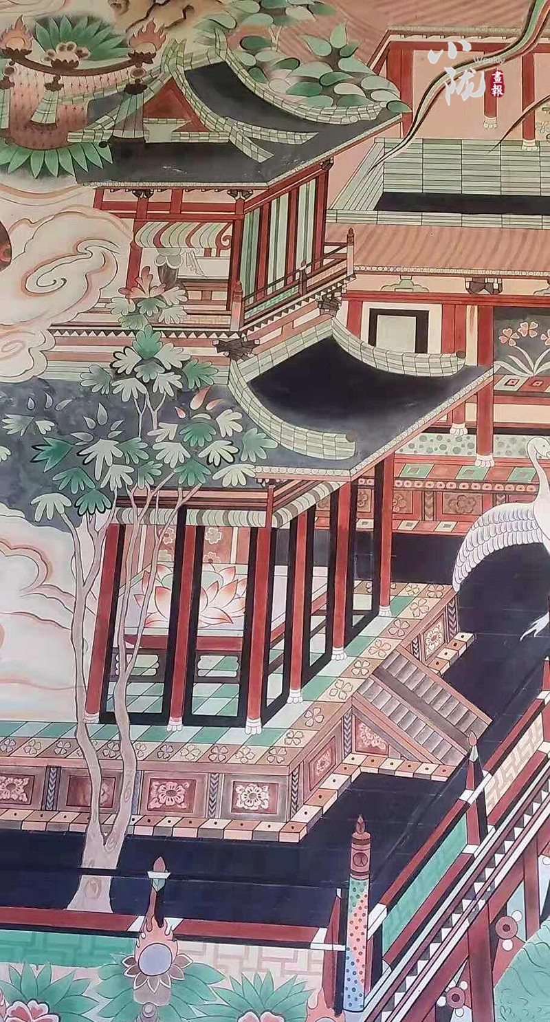 畫(huà)面的后方是亭臺(tái)樓閣,回廊里,左邊是白鶴展開(kāi)雙翅,嘴里好像發(fā)出美妙的聲音,迦陵頻伽人身鳥(niǎo)尾,雙手弄拍展翅而舞,尾如卷云漩渦。回廊右邊,共命鳥(niǎo)一身二頭,展翅而舞,孔雀輕歌曼舞,展翅回首,還有翩翩起舞的鸚鵡,他們是能為人言而美麗的祥鳥(niǎo),他們的聲音能增進(jìn)人們善德的力量,促進(jìn)人們?cè)缛者M(jìn)入想象的幸福世界。