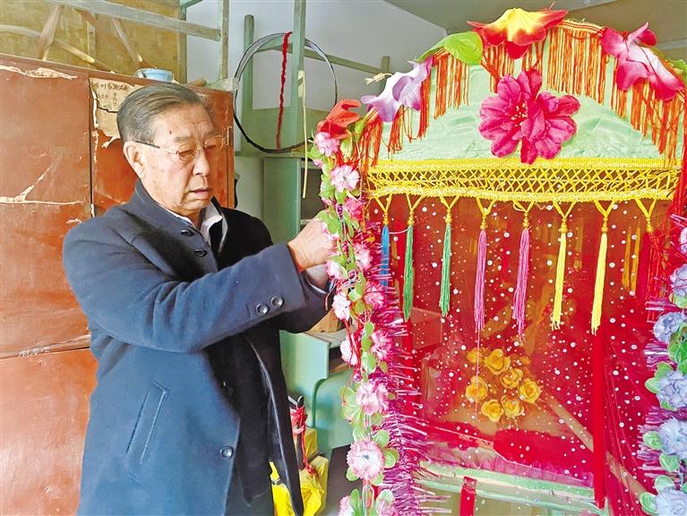 除了編排社火曲目,閆文發(fā)還親手制作道具。“有的道具貴,或者買不上,我就自己琢磨、自己做。”花轎、旱船、白龍馬……做得惟妙惟肖。“我們的曲目需要啥道具,閆老師都能做,手特別巧,給社火隊(duì)節(jié)約了不少成本。”隊(duì)友張吉榮對閆文發(fā)的手藝贊不絕口。