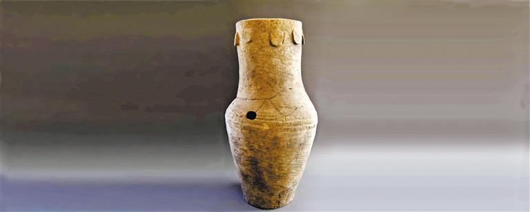 繩紋灰陶鼓直頸、鼓腹、平底,器型碩大,口徑30厘米,通高87厘米,地徑27厘米,是新石器時(shí)代馬家窯文化時(shí)期馬家窯類型。