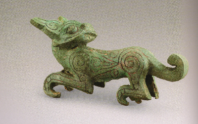 禮縣大堡子山祭祀樂器坑出土,共三只,造型相同,大小相似,為全國(guó)虎伴樂器出土的首例。其形象回首卷尾、聳耳曲爪、憨態(tài)可掬,極具觀賞性,是春秋時(shí)期虎造型的杰作,體現(xiàn)了秦國(guó)早期高超的造型能力和精湛的鑄造技術(shù)?;⒌男蜗笤诖呵锴厝说钠魑镏卸嘁姡坏凶猿蓚€(gè)體的金虎、青銅回首虎,同時(shí)虎作為附飾也出現(xiàn)在一些大的青銅器上。