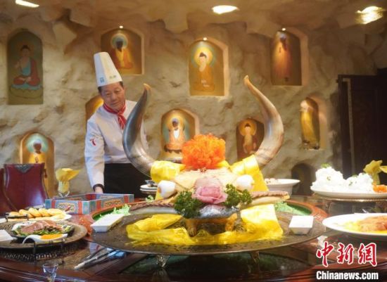 中新網(wǎng)蘭州3月29日電(張婧)“來自壁畫中的敦煌菜,背后都藏著真實存在的人或事、景或點。”國家特一級烹調(diào)師趙長安長期從事于敦煌菜的歸納與發(fā)展。他說,無論菜名還是菜式的賣相,都融入敦煌故事或圣境圣水,可謂“一菜一典故,一席十圣境”,讓人仿佛置身于古絲綢之路上。