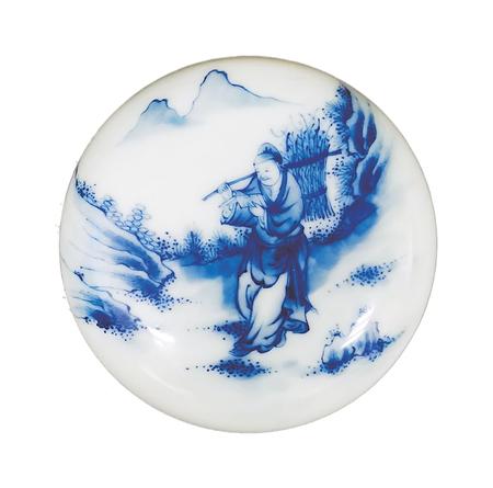 一件是青花印泥盒,制作于20世紀(jì)初。直徑7厘米,高3厘米,盒身扁圓,鼓腹,上下相合。盒蓋用青花繪“樵夫讀書”圖。畫面遠(yuǎn)處,兩座山峰高聳云間,四周樹木蔥蘢,山石嶙峋。畫面正中的山路上,一樵夫砍柴歸來,身背一大捆柴草,他右手扶著木棍,左手則捧著一本書,雙眼盯著書本,緊抿嘴唇,正津津有味地邊走邊讀。讀到精彩處,露出會(huì)心一笑??磥恚@個(gè)樵夫是極愛讀書的,這種好學(xué)精神,難道不值得我們學(xué)習(xí)嗎?這件瓷印泥盒,青花色澤典雅,人物衣褶神態(tài)描繪細(xì)致,栩栩如生,胎體堅(jiān)致,白釉溫潤(rùn),層次清晰,保存完好。