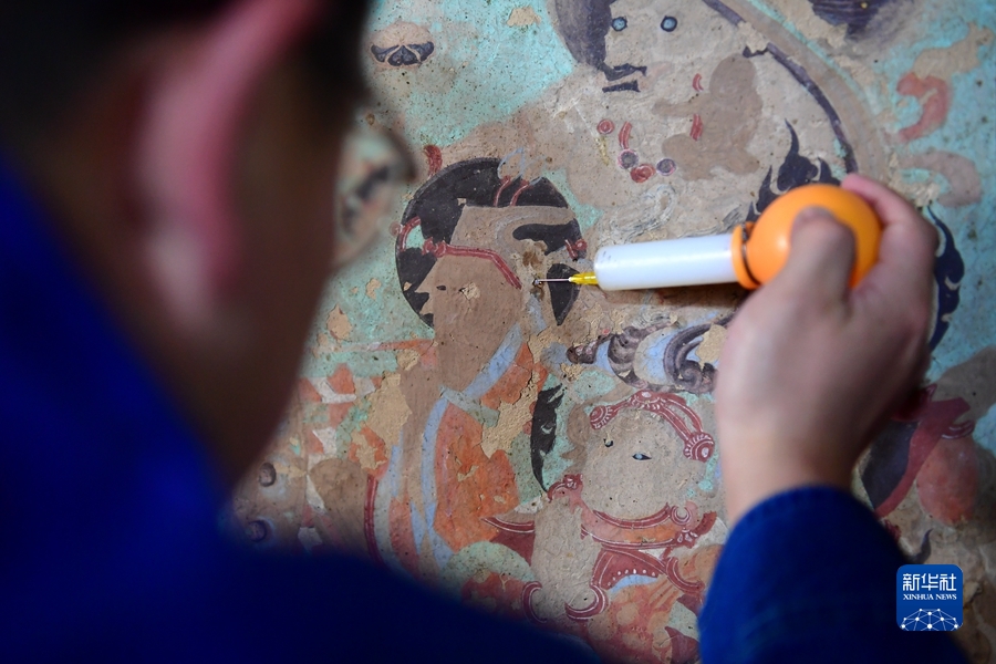 4月19日,在莫高窟第231窟,楊金禮在修復(fù)出現(xiàn)病害的壁畫。新華社記者 杜哲宇 攝
