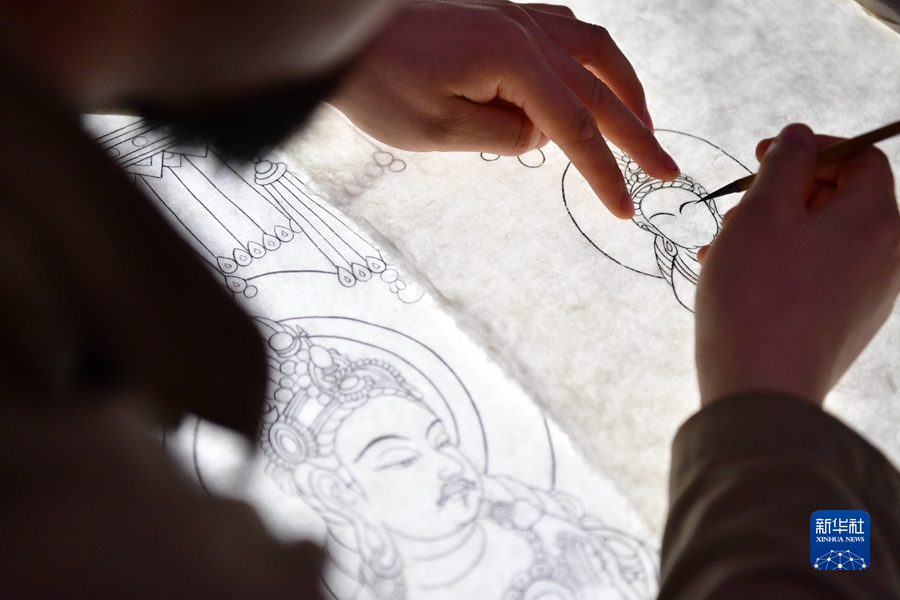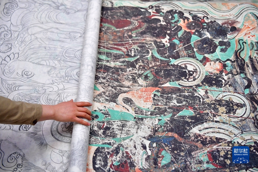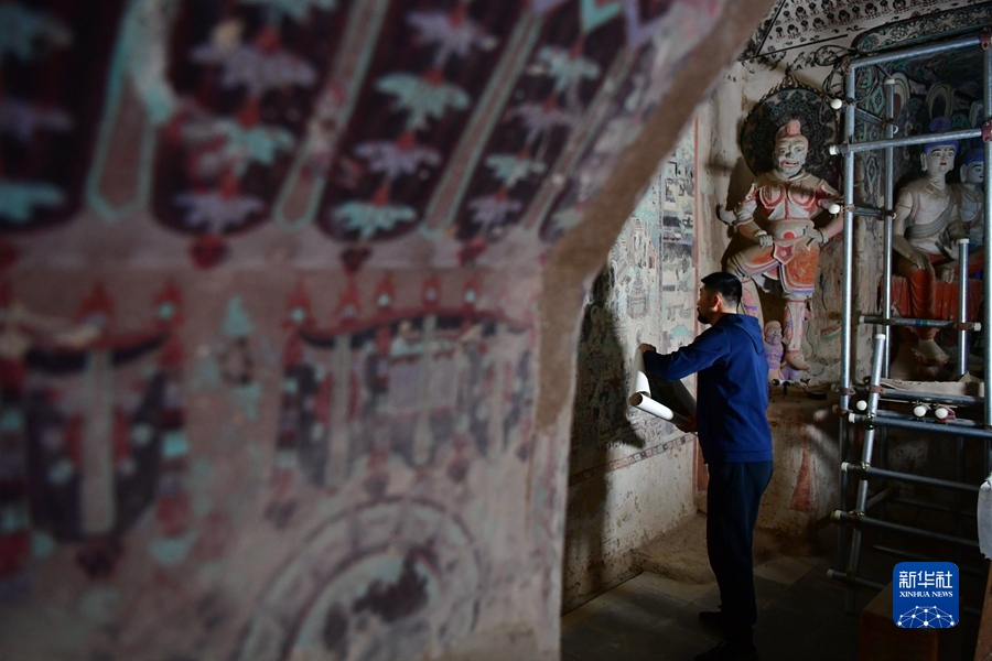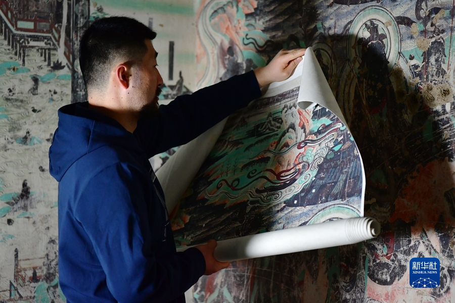 4月19日,在莫高窟第172窟,劉小同在對(duì)比臨摹壁畫的細(xì)節(jié)。新華社記者 杜哲宇 攝