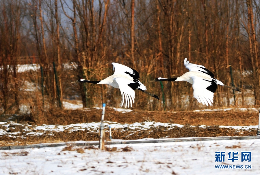 2月14日,雪后初晴,甘肅省張掖國(guó)家濕地公園放飛的十余只丹頂鶴翩翩起舞、嬉戲覓食,使雪后的濕地公園充滿生機(jī)。新華網(wǎng)發(fā)(陳禮 攝)