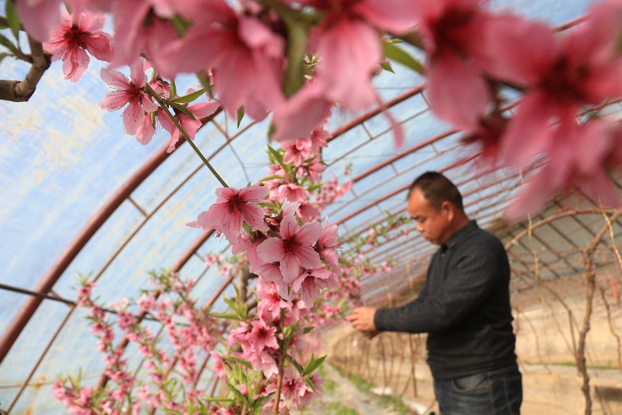 初春時節(jié),甘肅省敦煌市七里鎮(zhèn)戈壁設(shè)施農(nóng)業(yè)示范園區(qū)溫室中的桃花競相綻放,濃濃春意撲面而來,農(nóng)民忙著為桃樹壓枝、疏花,加強(qiáng)田間管理,為今年豐產(chǎn)豐收打牢基礎(chǔ)。