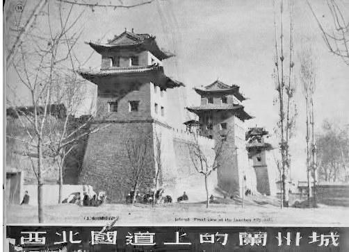 特別難得的是,他拍下了一張?zhí)m州城樓的照片,這是筆者見過的所有蘭州城樓中最壯觀的。照片上,中間的城門和兩個角樓并行排列,角樓前面是幾株西北地區(qū)常見的高聳挺拔的白楊樹,角樓底下是幾個正在等客人的黃包車夫。這座城樓是蘭州東郭城門迎恩門,俗稱東稍門(位于今東方紅廣場東口什字),中間有城門洞,南北兩側(cè)為角樓,無城門洞。