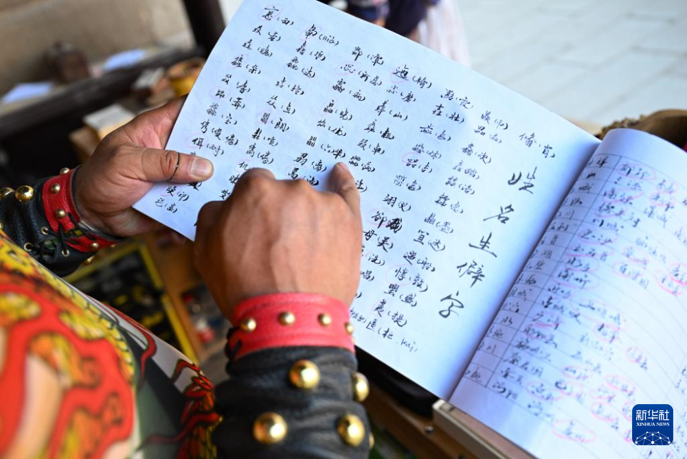 在甘肅嘉峪關(guān)關(guān)城景區(qū),李森在攤位上查閱自己編寫的含有生僻字讀音、城市古地名等內(nèi)容的小冊(cè)子(7月14日攝)。新華社記者 陳鐘昊 攝