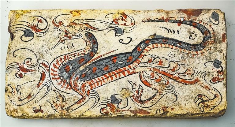 中國(guó)人恪守天人合一、陰陽(yáng)平衡、五行生克的風(fēng)水理論,風(fēng)水中龍脈對(duì)人心理的影響深遠(yuǎn),使得龍?jiān)诮ㄖb飾、墓葬中普遍應(yīng)用,成為中國(guó)建筑裝飾藝術(shù)的瑰寶。隨著兩漢磚室墓的出現(xiàn)和流行,由星辰崇拜衍生而來(lái)的四靈形象,逐漸成為墓葬建筑裝飾的重要元素,如金昌市博物館藏的魏晉青龍磚,龍首高昂,龍須上揚(yáng),曲頸挺胸,張口吟嘯,前肢登騰,后肢做行進(jìn)狀,周?chē)h(huán)繞云氣紋,有隨云彩而飛動(dòng)之感。