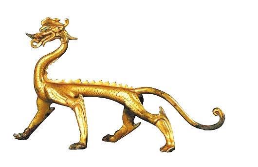 河南偃師的二里頭遺址出土了夏代龍文物,說(shuō)明此時(shí)龍已經(jīng)成為身份、地位的象征。商代開(kāi)始,龍的突出特征便是有了角,并多以夔龍紋等形象出現(xiàn)在青銅器上。春秋戰(zhàn)國(guó)時(shí)代是一個(gè)大變革、大發(fā)展的時(shí)代。與政治上諸侯爭(zhēng)雄、思想界百家爭(zhēng)鳴、陰陽(yáng)學(xué)說(shuō)盛行相適應(yīng),龍的圖案中出現(xiàn)了“群龍”和“交龍”形象。如甘肅省博物館收藏的戰(zhàn)國(guó)盤(pán)龍紋金飾片,兩條龍交叉盤(pán)繞,龍首一側(cè)飾兩條小龍,龍尾一側(cè)飾一對(duì)小虎,作咬噬龍尾狀,龍身上飾聯(lián)珠紋。隨著華夏大地結(jié)束戰(zhàn)亂,走向一統(tǒng),秦漢時(shí)代的龍出現(xiàn)相對(duì)規(guī)范和定型的趨勢(shì),并出現(xiàn)了背上長(zhǎng)翅膀的龍。魏晉南北朝時(shí)期龍形象對(duì)內(nèi)融合各少數(shù)民族文化,對(duì)外融合佛教文化,流行的龍紋頭部扁長(zhǎng),角似鹿角,發(fā)鬣后披,挺胸奮肢,呈現(xiàn)出矯健奔放、線(xiàn)條流暢、氣韻生動(dòng)的特點(diǎn)。