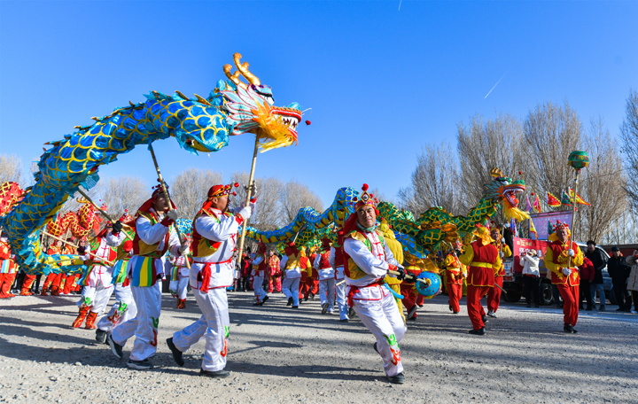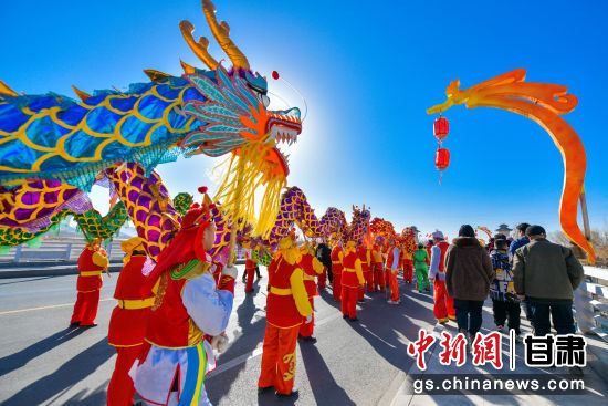 2024年2月14日,甘肅省敦煌市社火隊(duì)正在白馬塔景區(qū)進(jìn)行社火——舞龍表演。
