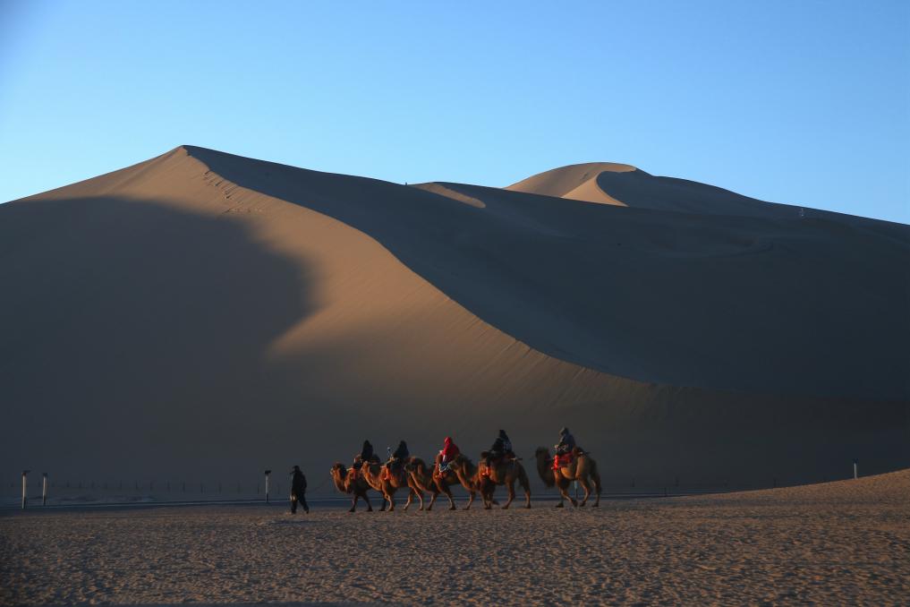 2024年2月10日,游客在甘肅省敦煌市鳴沙山月牙泉景區(qū)游覽。