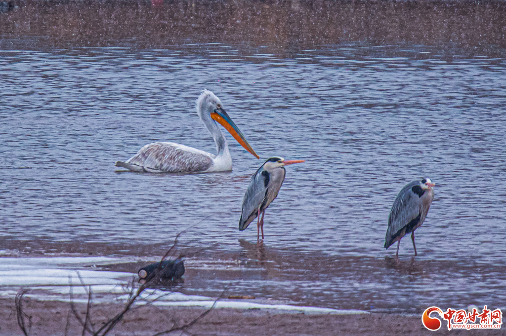 當(dāng)天,天空下著大雪,天氣寒冷,一位野生鳥類攝影愛好者驚喜地在崇信縣汭河段發(fā)現(xiàn)了一只卷羽鵜鶘盤旋于河道上空,經(jīng)過(guò)跟蹤其降落于發(fā)現(xiàn)地20里外的銅城水庫(kù)附近水域,與蒼鷺混群。