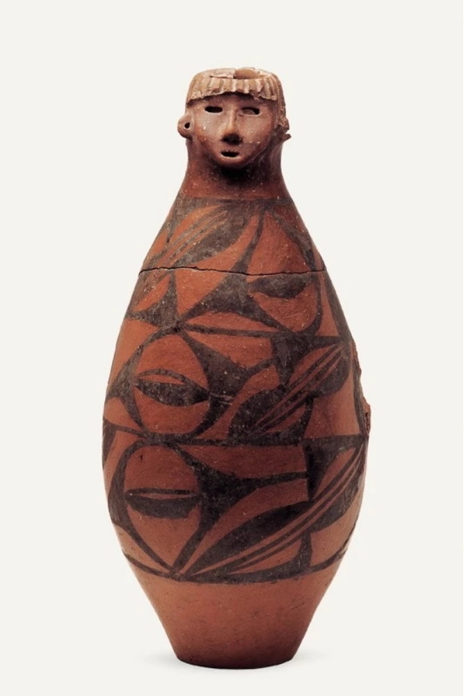 隴東少女作為甘肅的“顯眼包”之一,是曾在《國家寶藏》中出現(xiàn)過的“網(wǎng)紅”、甘肅省博物館鎮(zhèn)館之寶,它于1973年從秦安縣大地灣遺址出土。具有高度審美能力的“托尼”老師,設(shè)計了齊劉海發(fā)型,顯得很泰酷辣,圓鼓腹、平底,人們細(xì)看發(fā)現(xiàn),陶人的兩眼為圓孔洞,顯得目光深邃;鼻子呈蒜頭形,雕有鼻孔;嘴較小,微微張開,好像正在言語;兩耳外展,皆有穿孔;瓶體從上至下以黑彩飾三層大小相同、由弧線三角紋和斜線組成的二方連續(xù)圖案,以示華麗的衣物。另外,陶瓶人頭像的器口運(yùn)用了不同的制作手法,頭發(fā)、嘴系雕刻而成,鼻、臉是捏塑而成。人頭像五官整齊、面龐秀麗,器身造型典雅,與人物形象渾然一體,既是大地灣文化彩陶的代表作,也是中國史前集彩繪、雕塑與造型藝術(shù)于一身的杰作。估計任誰看一眼,都會被“她”的神秘和美麗所吸引吧。