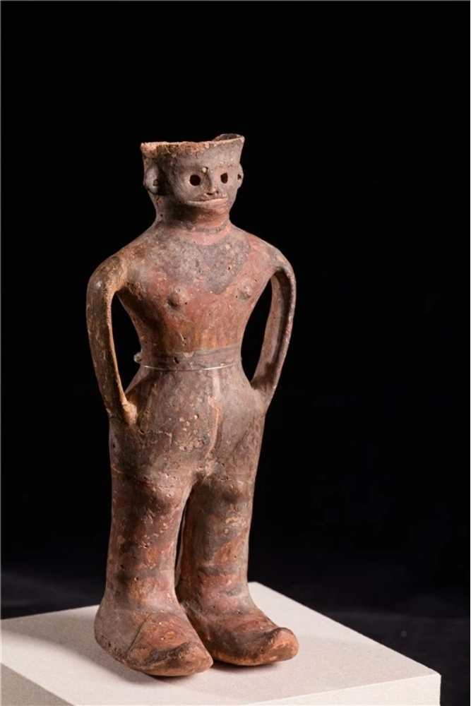 “河西少年”——人形彩陶罐出土于火燒溝遺址,國家一級珍貴文物, 1990年作為甘肅省選送的8件精品文物之一在舉辦第十一屆北京亞運(yùn)會期間向中外游客展出。遠(yuǎn)看是一名雙手插兜站立的酷少年,其體 態(tài)、動作和神情刻畫得栩栩如生;走近一看,人像短發(fā)、高鼻深目、雙耳開孔、表情生動,其身 著短上衣,頸部至胸前的網(wǎng)格紋就像是戴有精美的項飾,下身著網(wǎng)格長褲裙,雙手插在褲兜里, 碩大的雙腳上穿著肥大的高腰靴子,一副怡然自得的樣子。陶罐人體中空,可以盛水, 插入褲兜的雙臂形成陶罐的雙耳,設(shè)計大膽,制作精巧。2023年玉門市博物館參加的騰訊探元文化創(chuàng)新大賽“古物換新樣”中,“河西少年”成為追捧的對象,在眾多參賽作品中脫穎而出,被很多設(shè)計師設(shè)計成了背包、花盆、臺燈、盲盒等文創(chuàng)產(chǎn)品。