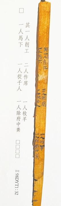 簡7是都尉府戍卒日作簿,戍卒分工簡明清楚。“削工”用紅柳、胡楊木削制簡牘。作席,疏勒河沿岸生長著大量芨芨草、蘆葦,戍卒用來編制席笆,用于防潮御寒。疏勒河沿岸水草豐茂,適宜放牧。“一人牧羊”可知,養(yǎng)牛、羊供都尉府吏員食用。“一人馬下”,由于缺當(dāng)時(shí)的語言環(huán)境,釋義模糊。千人是都尉府中級軍官職務(wù)。除府中糞,清除廁所糞便。