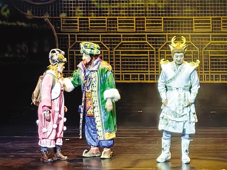 演出現(xiàn)場(chǎng),大美敦煌被搬到舞臺(tái)上,星云變幻間,時(shí)空在劇場(chǎng)轉(zhuǎn)換,鹿鳴、莉娜、巴巴亞穿梭在沙漠、月牙泉和莫高窟、敦煌市集之間,與“先知”對(duì)話,向神仙請(qǐng)教,與沙塵暴斗爭(zhēng),根據(jù)蛛絲馬跡尋找3件天宮樂器的下落。