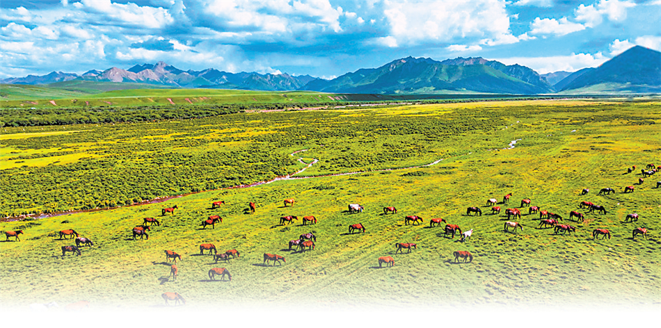 白雪皚皚的祁連山下,一眼望不到邊的大片牧草青翠碧綠,色彩斑斕的野花競(jìng)相開放,擁有百萬(wàn)畝草原的山丹馬場(chǎng)如巨幅彩色畫卷徐徐展開。
