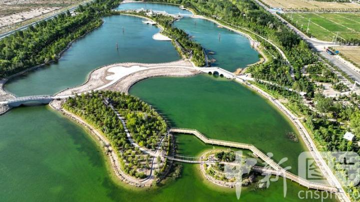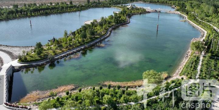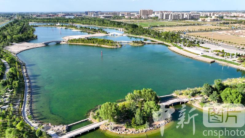 2024年7月27日,航拍甘肅省酒泉市金塔縣城西生態(tài)湖,綠意盎然,生機(jī)勃勃,構(gòu)成了“戈壁水鄉(xiāng)”的獨(dú)特畫(huà)卷。中新社發(fā) 曹紅祖 攝