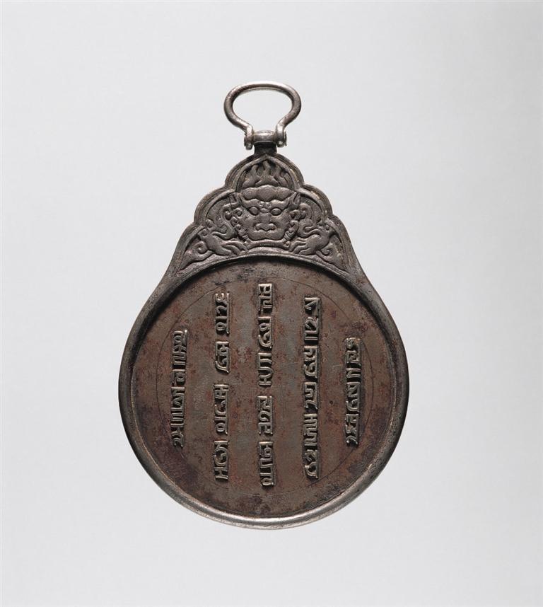 八思巴文虎頭銀符鐵牌,元代,符牌兩面鑲嵌八思巴文銀字,譯為“上天眷命,皇帝聖旨:如不欽奉虔敬,治罪”。廓外上有葉狀鈕座,座內(nèi)鑄虎頭紋,座頂有橢圓形環(huán)鈕。這種虎符圓牌專為傳遞“軍情急務(wù)”而設(shè),持之可進(jìn)出全國各地及四大汗國,域跨歐亞,故有“國際通行證”之稱,是研究元代急遞制度以及政治史、民族文字等方面的珍貴實(shí)物資料。這種符牌使用范圍十分嚴(yán)格,故全世界現(xiàn)存數(shù)量極少。