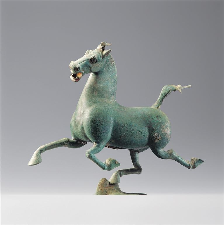 銅奔馬,東漢,1969年武威市雷臺(tái)墓出土。馬作奔騰狀,三足騰空,右后蹄踏一展翅飛翔、回首驚顧的飛鳥。奔馬全身著力點(diǎn)集于超掠飛鳥的一足之上,準(zhǔn)確地把握了力學(xué)平衡。蹄踏飛鳥,表現(xiàn)出馬行迅疾,在鳥驚回首的剎那已經(jīng)超越了飛行的鳥。銅奔馬鑄造精美,構(gòu)思巧妙,為我國青銅藝術(shù)中罕見的杰作,1983年被確定為中國旅游標(biāo)志,2002年被國家文物局列入首批禁止出國(境)展覽文物目錄。它以卓絕的藝術(shù)造詣千古生輝,成為中華民族勇往直前、積極進(jìn)取偉大氣質(zhì)的象征。
