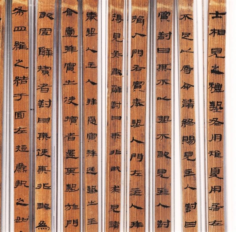 《儀禮》簡,西漢,武威磨嘴子出土。分木質(zhì)和竹質(zhì)兩種,共496枚,編為甲、乙、丙三本,系先編后寫。甲本為《儀禮》17篇中的7篇,乙本僅存《服傳》一篇,丙本僅存《喪服》一篇。該簡冊(cè)保存基本完好,與傳世的鄭玄注本不同,應(yīng)是目前所見《儀禮》的最古寫本,在版本??鄙嫌泻芨叩膬r(jià)值,且書寫工整秀麗,是漢代墨寫隸書的上品。