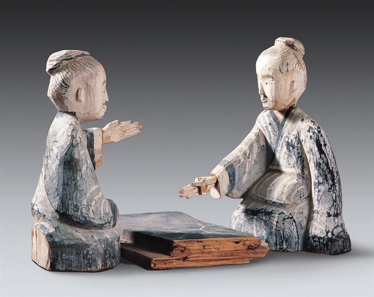 彩繪木六博俑,西漢,武威磨嘴子出土。木俑為兩位跪坐對(duì)局的老者形象,二者間設(shè)一長方形棋盤。老者神情凝滯,蓄勢待發(fā),顯然正在緊張的六博對(duì)局之中??脊虐l(fā)現(xiàn)中不乏漢代博局、棋子、骰子等六博器具,漢墓畫像磚中也常見相關(guān)圖像,但以雕塑刻畫六博對(duì)局卻極為罕見,這件文物充分體現(xiàn)了漢代木雕藝術(shù)所達(dá)到的高度與境界。