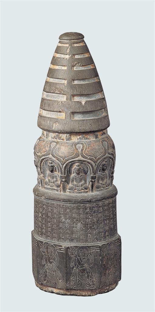 高善穆石造像塔,1969年甘肅省酒泉市出土。寶蓋、相輪、塔頸、塔肩、塔基一應(yīng)俱全,底部有榫頭。寶蓋頂端中間刻北斗七星,塔腹陰刻《增一阿含經(jīng)·結(jié)禁品》的前半部分及發(fā)愿文,有承玄元年(公元428年)紀(jì)年。塔基為八面形,每面陰刻一像,像左側(cè)上方刻八卦符號(hào)。該造像塔是現(xiàn)存北涼石塔中保存最完整的一件,在造型上繼承了犍陀羅供養(yǎng)小塔的基本造型特征,又有了新的發(fā)展,如塔頂端的北斗七星,塔基的八卦符號(hào)等,體現(xiàn)出佛教文化和中國本土文化之間的碰撞和融合,是研究早期佛教藝術(shù)和佛教思想的重要標(biāo)本。