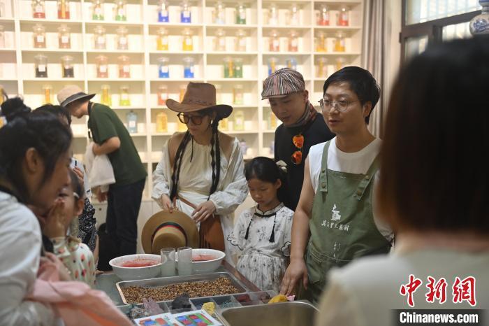 8月20日,甘肅敦煌莫高里工匠村內(nèi),研學(xué)導(dǎo)師向?qū)W員介紹敦煌礦物質(zhì)顏料。工匠村開設(shè)了泥板畫、彩繪、雕塑制作、剪紙、農(nóng)耕體驗(yàn)等課程,現(xiàn)已發(fā)展成為一個集敦煌文化講堂、壁畫書法研習(xí)、美術(shù)設(shè)計、彩塑制作教學(xué)、篆刻藝術(shù)、傳統(tǒng)釀酒體驗(yàn)、農(nóng)業(yè)產(chǎn)業(yè)發(fā)展等于一體的多功能實(shí)訓(xùn)基地。中新社記者 李亞龍 攝