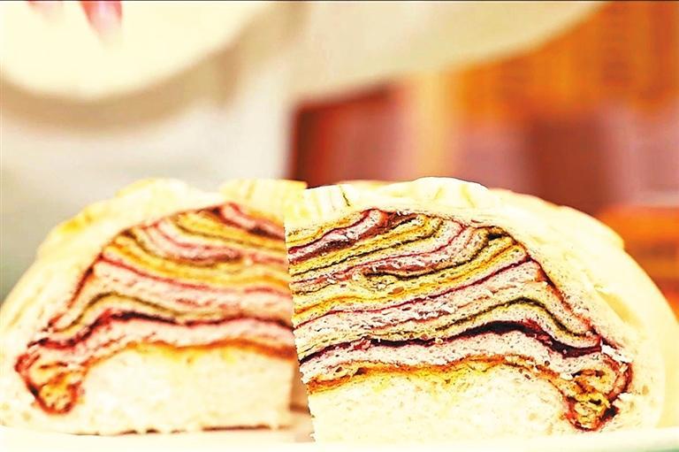 母親最拿手的還是做千層大月餅,做法與平常做饃有點(diǎn)不一樣,發(fā)好面后取適量揉好,切成同樣大小的若干份并搟壓成長(zhǎng)方形的薄面皮。一層薄皮一層餡,餡料與烙的糖饃有的不一樣,重在色澤,每層分別抹上姜黃、紅曲、苦豆(香豆)粉、芝麻、菜籽油、糖玫瑰、葡萄干,黃、紅、黑、綠相間,一層黃一層綠一層紅一層黑,一層白糖一層紅糖一層玫瑰糖,一層一層摞好,做成一個(gè)六七層的圓餅。最后用薄皮蓋住一摞摞面皮,餅邊捏緊捏好后壓花塑形,表面用模型壓花,用專用做飯梳子一行行點(diǎn)上,或一行白鷺上青天,面皮如一塊畫(huà)布,精雕細(xì)琢,怎么好看怎么做,做得隨心所欲又精心設(shè)計(jì)。還會(huì)刷姜黃與菜籽油拌好的油料,撒上芝麻粒和葡萄干,一個(gè)千層餅就基本成型了。