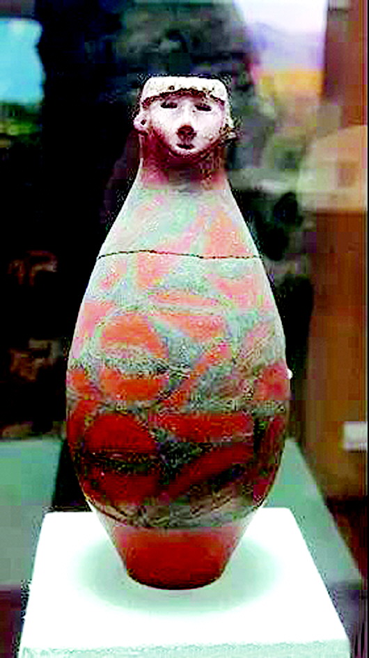 這件距今約6000年的文物,高31.8厘米,口徑4.5厘米,底徑6.8厘米,被許多人稱之為半神半人彩陶瓶。瓶為細泥紅陶質地,腹部以上施陶衣。器型為兩頭尖的圓柱體,下腹內收。瓶器口為圓雕人頭像,披發(fā),堪稱遠古時期的雕塑杰作。