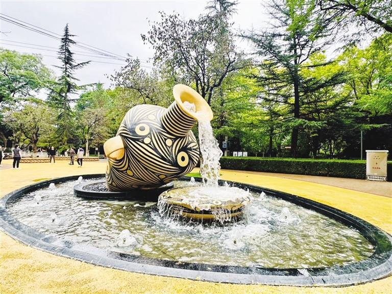 走進(jìn)公園(東口),入口處以“大河厚土孕彩陶”為主題的彩陶墻格外顯眼,墻上鑲嵌著不同造型和樣式的彩陶,分別介紹了大地灣文化彩陶、仰韶文化彩陶、馬家窯文化彩陶、齊家文化彩陶四個不同歷史發(fā)展時期。沿健身步道向西行進(jìn),體量巨大的馬家窯旋紋彩陶尖底瓶正向旋紋彩陶盆內(nèi)倒入“黃河之水”,這一景觀便是“彩陶流水”節(jié)點(diǎn),景觀造型采用跌水、涌泉的形式,打造出彩陶流水的動態(tài)效果,象征著黃河文化的源遠(yuǎn)流長。