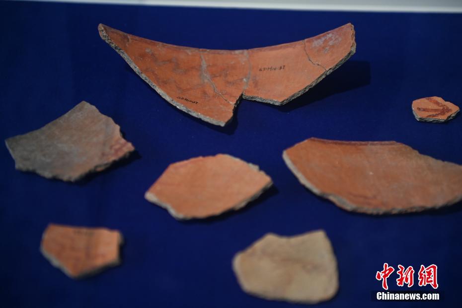 10月22日,2024青年漢學(xué)家研修計(jì)劃甘肅班團(tuán)隊(duì)22個(gè)國(guó)家的青年漢學(xué)家,走進(jìn)甘肅省天水市秦安縣大地灣遺址參觀并進(jìn)行專題研修。大地灣遺址是新石器時(shí)代大型聚落遺址,出土了中國(guó)乃至世界上最早的彩陶文化、最早的文字符號(hào)、種植生產(chǎn)了中國(guó)第一批糧食品種黍、出現(xiàn)了最早的宮殿式建筑、發(fā)明了世界最早的水泥地面、創(chuàng)造了最早的繪畫作品——F411地畫。圖為大地灣博物館展品最早的文字符號(hào)彩繪符號(hào)陶片。中新社記者 李亞龍 攝