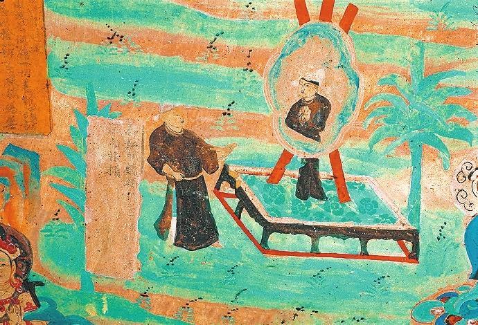 戰(zhàn)國時(shí)期楚國詩人屈原在《漁父》一文中寫道:“吾聞之,新沐者必彈冠,新浴者必振衣。安能以身之察察,受物之汶汶者乎?”意思是說我聽說剛洗過頭的人一定會(huì)去彈彈帽子上的灰塵;剛洗過澡的人一定要抖抖衣服的灰塵。怎能讓清白的身體去接觸世俗塵埃的污染呢?當(dāng)年的敦煌人走出溫泉,在身心放松之后,就該靜觀返照自己了。在莫高窟第85窟中有一幅“曲花式鏡圖”:畫面上在一個(gè)正方形鏤空的底座上擺放著一個(gè)巨大的曲花式鏡,鏡子式樣別致,明亮澄澈。藍(lán)色的曲花式樣引人矚目。但畫面上最吸睛的是一位魁梧俊朗身著一襲赭色長袍的男子,他正在鏡子前仔細(xì)地打量自己,而鏡中映射出他神情凝重的情態(tài)來。原來,古人照鏡除了正衣冠之外,還有反觀自照的含義,在鏡子前良久地注視自己,就是對(duì)自己反省、頓悟的過程。“一年好景君須記”,走過四季,到了歲末,該是每個(gè)人回望來時(shí)路,展望前方的時(shí)候了。