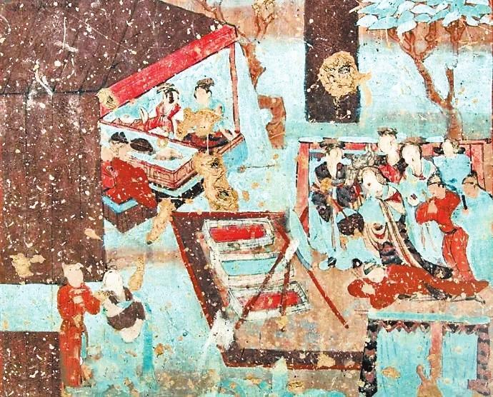 古人會(huì)在一年的歲末舉行一次集體聚會(huì),稱作“建福”。在敦煌文獻(xiàn)《社司轉(zhuǎn)帖》中寫道:“右緣常年建福一日,人各爐餅壹雙,凈粟壹斗。幸請(qǐng)諸公等,帖至限今月廿二日卯時(shí)于安家酒店取齊。”意思是說,只要有可能,每年到了年末大家都要選擇一日來進(jìn)行建福。每家每戶需要按時(shí)把準(zhǔn)備建福的物資送過來。唐朝詩人李白在《客中行》一詩中寫道:“蘭陵美酒郁金香,玉碗盛來琥珀光。但使主人能醉客,不知何處是他鄉(xiāng)。”意思是說蘭陵美酒甘醇甜美,就像郁金香一樣芬芳四溢。興來盛滿玉碗,泛出琥珀光晶瑩迷人。主人端出如此好酒,定能醉倒他鄉(xiāng)之客。飲酒之后哪能分清故鄉(xiāng)與他鄉(xiāng)呢?歲暮聚飲蘊(yùn)含有辭舊迎新、攘兇納吉的美好愿望。在莫高窟第12窟壁畫中有一幅“帳篷酒肆圖”:畫面中圍坐在條形長桌兩邊正盡興暢飲的客人為七人,還有兩個(gè)熱情忙碌的服務(wù)人員。整個(gè)畫面是一幅酒酣耳熱、興致高昂的歡飲圖。更為氣勢(shì)恢宏、熱鬧非凡的是莫高窟第23窟壁畫中一幅“院落圖”:畫面中分院落之內(nèi)與院落之外兩個(gè)部分,院落之內(nèi)是世俗的世界,畫面上布局著鱗次櫛比的廳堂房屋,有人正在庖廚、有人正在對(duì)弈、有人正在暢聊、有人正在團(tuán)聚,也有人正在說教,總之表現(xiàn)的是我們?nèi)粘I畹陌賾B(tài)。院落之外是佛國世界,整體呈現(xiàn)出肅穆莊嚴(yán)之感。有趣的是在佛國與世俗世界中間,畫的是服飾艷麗,騎馬遠(yuǎn)行的人們。