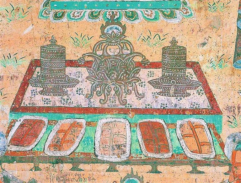 宋朝詩人陸游在《食粥》一詩中寫道:“世人個(gè)個(gè)學(xué)長年,不悟長年在目前。我得宛丘平易法,只將食粥致神仙。”意思是說人人都期盼長壽,怎么也沒有想到,我就成了長壽之人。如果讓我總結(jié)一下我長壽的秘訣,那就是我喝的粥多而已。想想冬天到了,天寒地凍,喝碗粥,渾身上下暖烘烘的多美啊。可是在敦煌壁畫里,人們?cè)诙静皇呛戎啵呛葻崤D?。在莫高窟?46窟壁畫中有一幅“擠牛奶圖”:畫面上一頭健碩的母牛正在被人擠奶,它回首望向擠奶者。在它的身下,還有一只小牛犢正貪婪地望著擠奶者。兩頭牛都憨態(tài)可掬、萌蠢可愛。漫天飛雪中,煮沸的牛奶溫暖著漫長冬季的每時(shí)每刻。在莫高窟第302窟中有一幅“湯水浴圖”。湯水就是溫泉。畫面上在樹木掩映之下有一池溫泉,有一大一小兩個(gè)人正沉浸在溫泉沐浴的歡快之中??梢?,伴著紛飛的大雪泡個(gè)溫泉,不是只有今天才有的享受;在千年之前的敦煌,人們就已經(jīng)開始修建溫室浴池,而且引水排水的技術(shù)已經(jīng)較為完善。院落依依、親朋融融、池水湯湯、筋骨軟軟,逸興悠悠。
