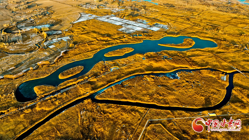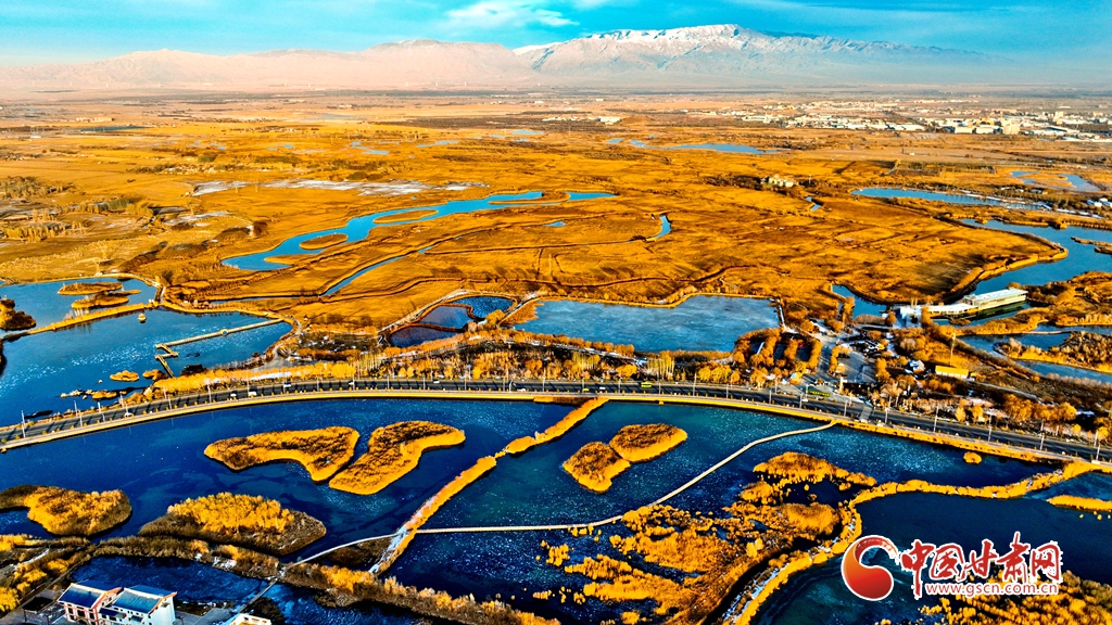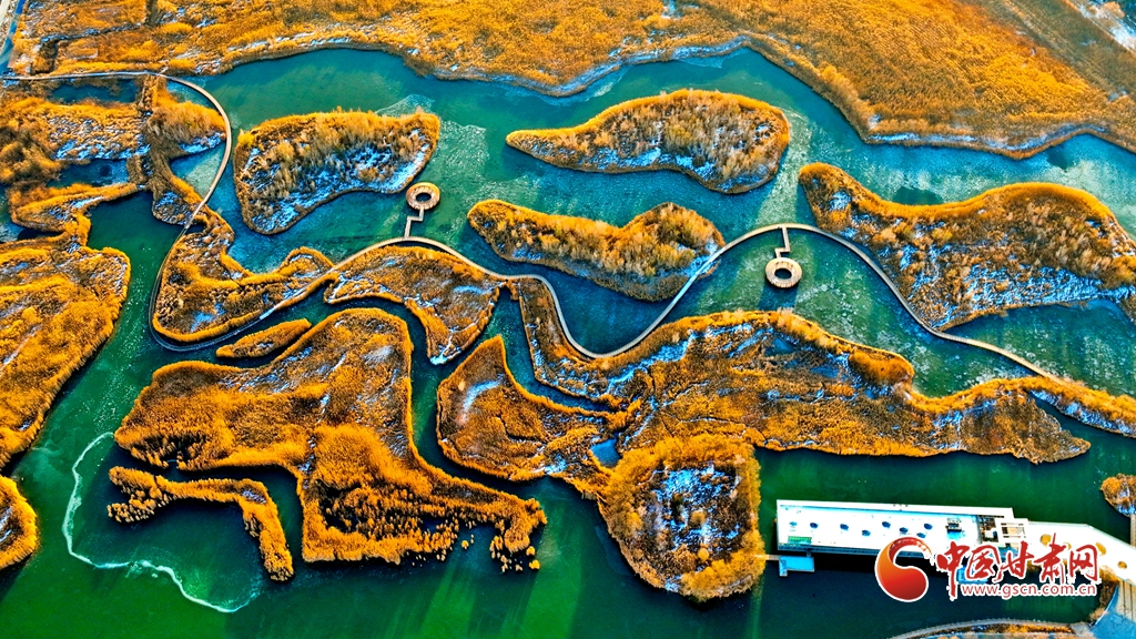 12月1日,俯瞰甘肅張掖國(guó)家濕地公園,夕陽(yáng)余暉映照,金色茂密的蘆葦隨風(fēng)搖曳,蘆花翩翩起舞,碧波蕩漾的水面逐漸凝結(jié)成冰,整個(gè)濕地化作一片金色的童話(huà)仙境,令人陶醉于無(wú)盡的遐想之中。
