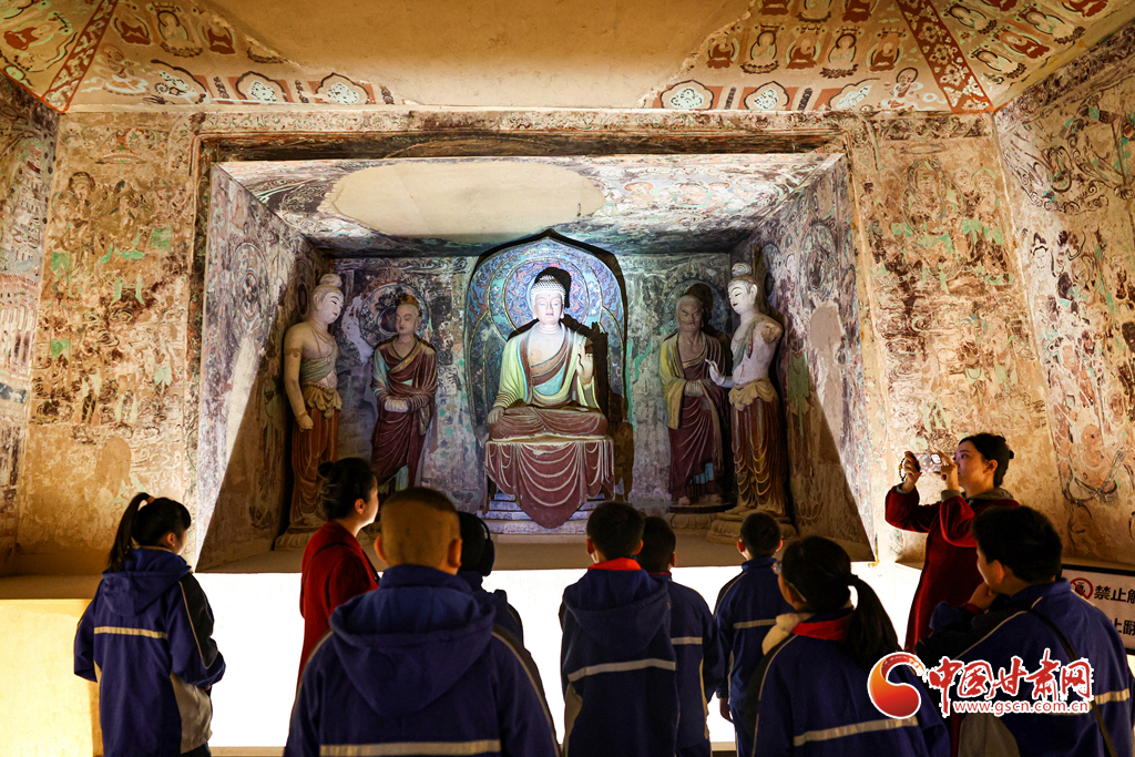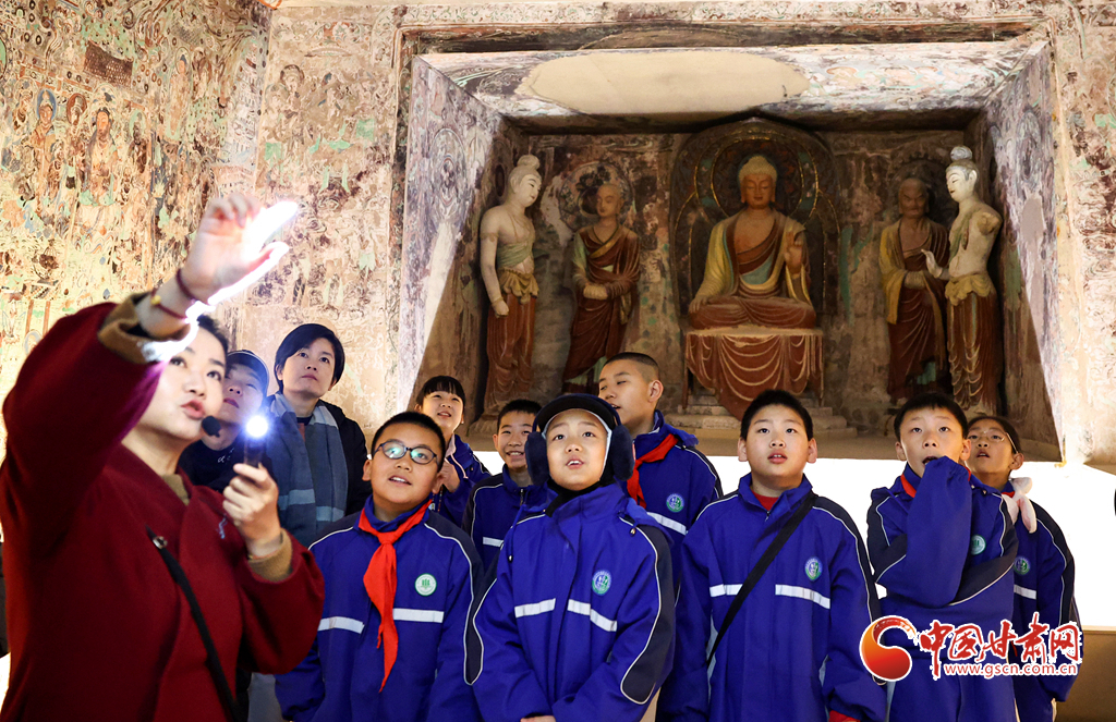 12月29日,蘭州市城關(guān)區(qū)安樂村小學(xué)學(xué)生在家人的陪同下來到敦煌研究院蘭州分院敦煌藝術(shù)館,欣賞“覺色敦煌 莫高精神”敦煌石窟藝術(shù)展,在周末時光近距離感受敦煌文化藝術(shù)的魅力。
