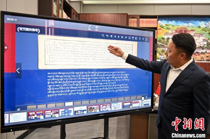 2月27日,在甘肅甘南藏族自治州碌曲縣益西達吉科技有限公司內(nèi),工作人員正在進行藏文古籍數(shù)字化相關(guān)工作。該公司主要從事民族古籍數(shù)字化建設(shè)和古籍文獻數(shù)據(jù)庫建設(shè),自2019年以來,承擔西藏、四川、甘肅等省區(qū)的藏文古籍數(shù)字化項目。圖為工作人員介紹藏文古籍數(shù)字化相關(guān)工作。中新社記者 九美旦增 攝