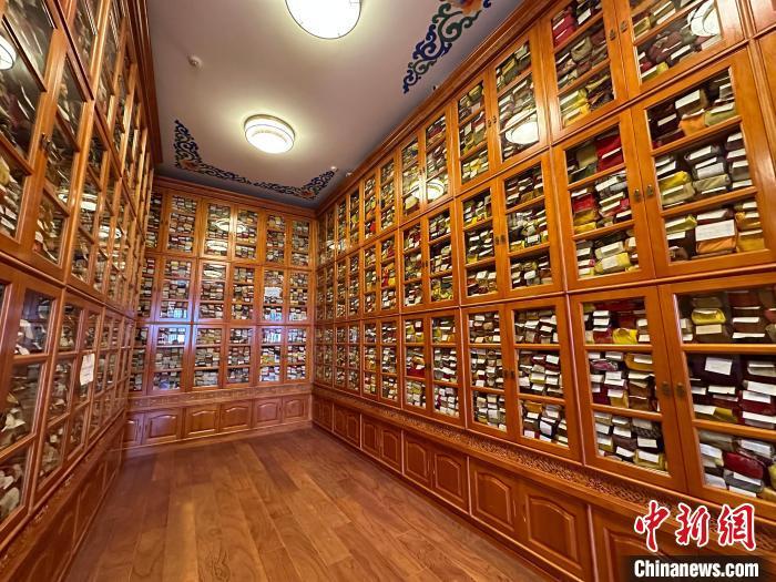2月28日,修繕后的拉卜楞寺藏經(jīng)樓內(nèi),所藏古籍文獻(xiàn)整齊擺放于新書(shū)架上。中新社記者 丁思 攝