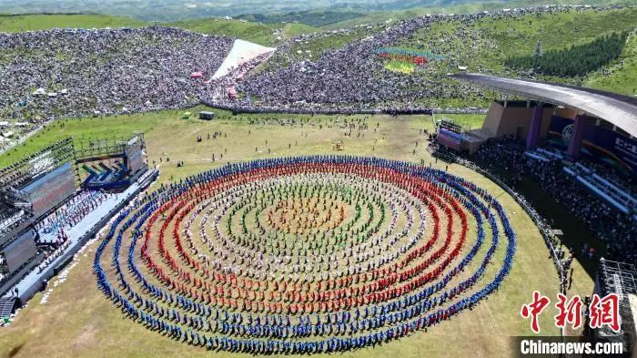 2024年8月4日,第22屆九色甘南香巴拉旅游藝術(shù)節(jié)在甘肅省甘南藏族自治州當(dāng)周草原開幕。圖為開幕式現(xiàn)場鍋莊舞表演。(資料圖)九美旦增 攝