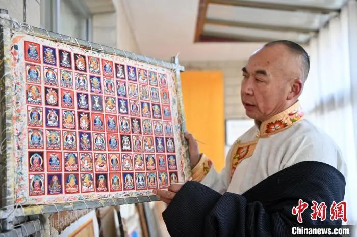 2024年2月2日,甘肅夏河,甘南藏族唐卡國家級代表性傳承人交巴加布在家中展示其繪制的唐卡。(資料圖)九美旦增 攝