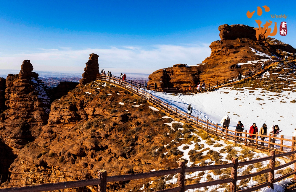 紅色丹霞被春雪覆蓋,在陽光的照耀下,紅色山崖層層疊疊、縱橫交錯,皚皚白雪點綴其中,唯美壯觀。平山湖的山,就在這樣悄無聲息的雪中,幻化成了氣勢磅礴的丹霞,綿延千里,浩瀚無邊。
