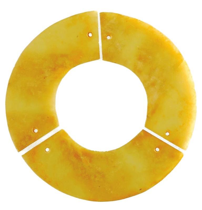 玉璜長(zhǎng)11.5厘米、寬3.5厘米、厚0.3厘米,征集所得。青玉料,色灰白,有黃褐或灰白沁斑,質(zhì)地細(xì)潤(rùn)透亮?;⌒纹瑺睿踩龎K。每塊兩端邊齊直,并各有一個(gè)單面鉆小孔,制作規(guī)整。