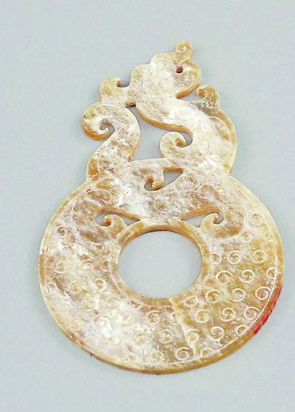 玉璧通高11厘米、直徑6.9厘米、孔徑2.4厘米、厚0.4厘米,征集品。玉料為青玉,整體顏色為青灰色,有灰白沁。琢磨成形,體呈平片狀。下部呈圓形,中有圓孔,孔徑小于肉寬,三分之二雕稀疏谷紋。龍首與龍尾出于璧廓之外,腹部鏤雕在璧孔之上的肉部,有三個(gè)一端彎鉤的三角狀鏤孔,其中下部?jī)蓚€(gè)鏤孔左右對(duì)稱(chēng)。龍昂首,軀體屈曲,尾部卷而上貼首后,有騰空而起之勢(shì)。龍首尾之間有一個(gè)不規(guī)則的大鏤孔,龍嘴上有一圓形小系孔。